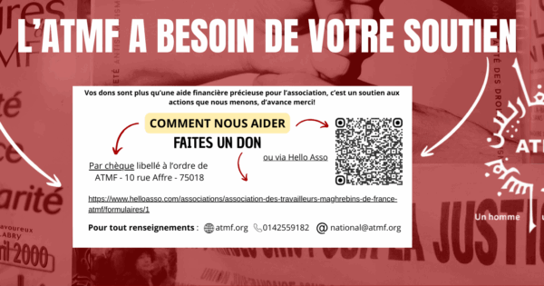Les dons peuvent être réalisés via notre campagne Helloasso : https://www.helloasso.com/associations/association-des-travailleurs-maghrebins-de-france-atmf/formulaires/1